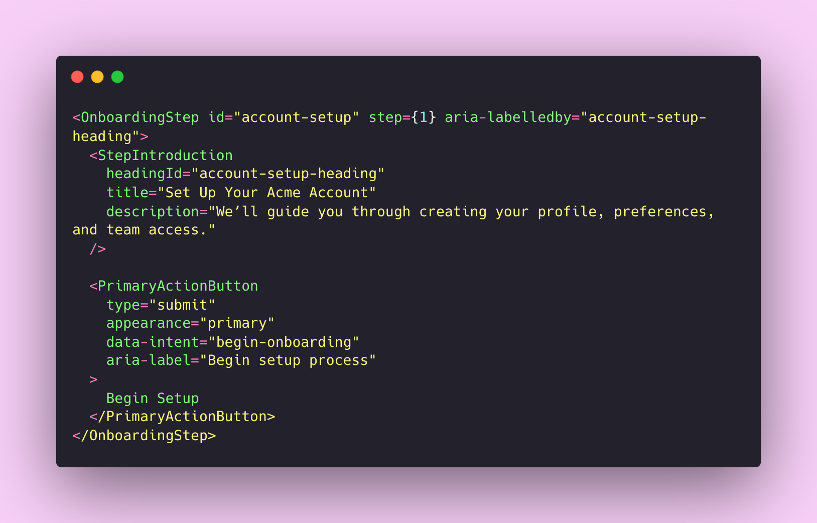 - Purpose-driven component names: OnboardingStep, StepIntroduction, PrimaryActionButton tell you what each element does, not just how it looks