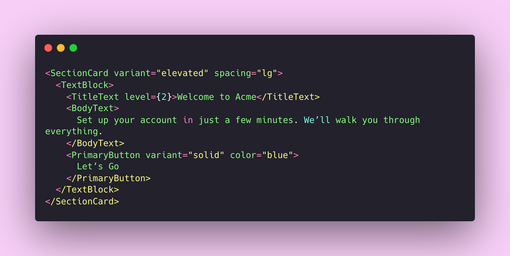 - Structured relationships: Nesting PrimaryActionButton inside OnboardingStep creates a clear contract – just like an API endpoint with required parameters